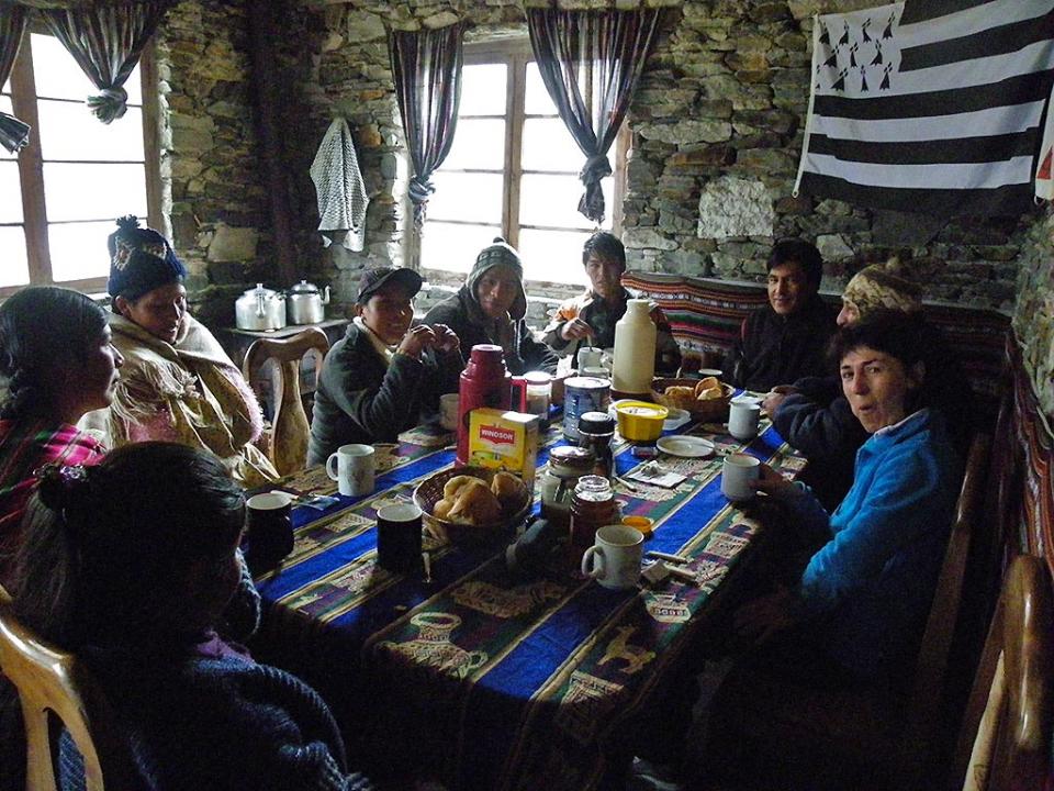 En début d’après-midi vous partez jusqu’au refuge Santos à 4 400 m d’altitude. Ce refuge est situé en pleine Cordillère Royale. Vous passerez par le col Mollo au pied du glacier WilaLluxita avant de descendre sur la Mina Fabulosa et de rejoindre le refuge Santos. Vous découvrirez alors le projet « Qala Uta » né au début de l’année 2002, à l’initiative de quelques familles des communautés d’UmaPalca et de Challana. Les membres de Qala Uta ont alors dessiné le projet de mettre au service des visiteurs leurs connaissances de la montagne, de leur faire découvrir leur culture Aymara et leur mode de vie communautaire. Dans cette magnifique vallée, la communauté a construit ce beau refuge tout en pierre. Vous dînez sur place puis vous passez la nuit au refuge.